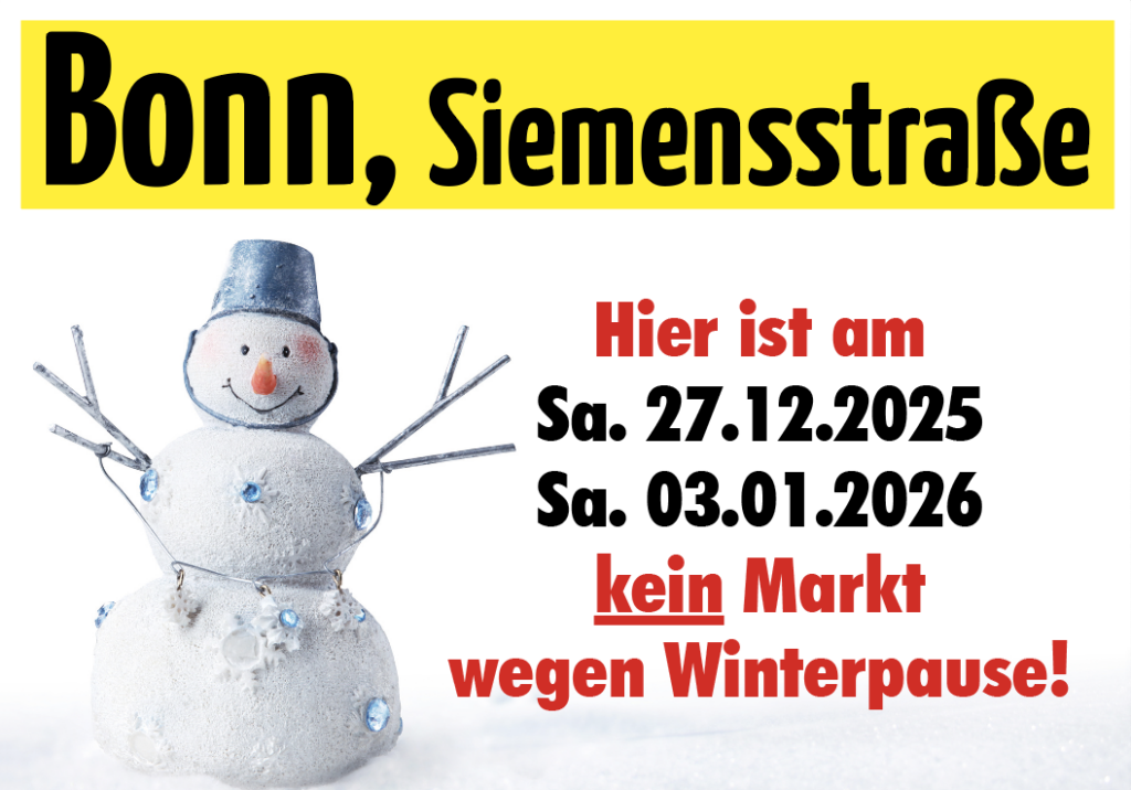 | jeden Samstag | 53121 | Bonn, Siemensstraße, Parkplatz (08:00-14:00 Uhr) außer am 27.12.2025 und 03.01.2026 – kein Markt wegen Winterpause! mehr zum Markt… |